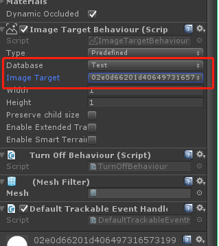 第十五步:设置ImageTarget(拖入层级面板中的第二个预设物),点击,在属性面板上操作入下图所示,设置Database和ImageTarget