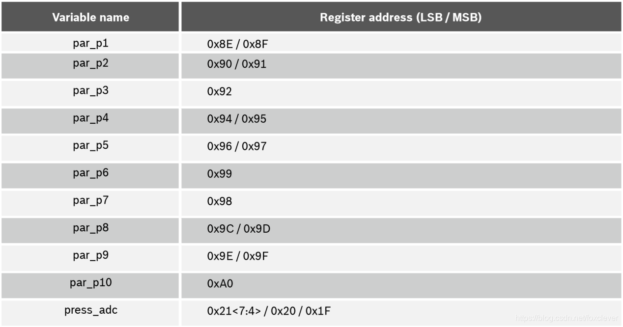 对于压力传感器,包括10个计算校准数据和一个ADC转换数据,其测量数据的校准数据存储结构及地址如下: