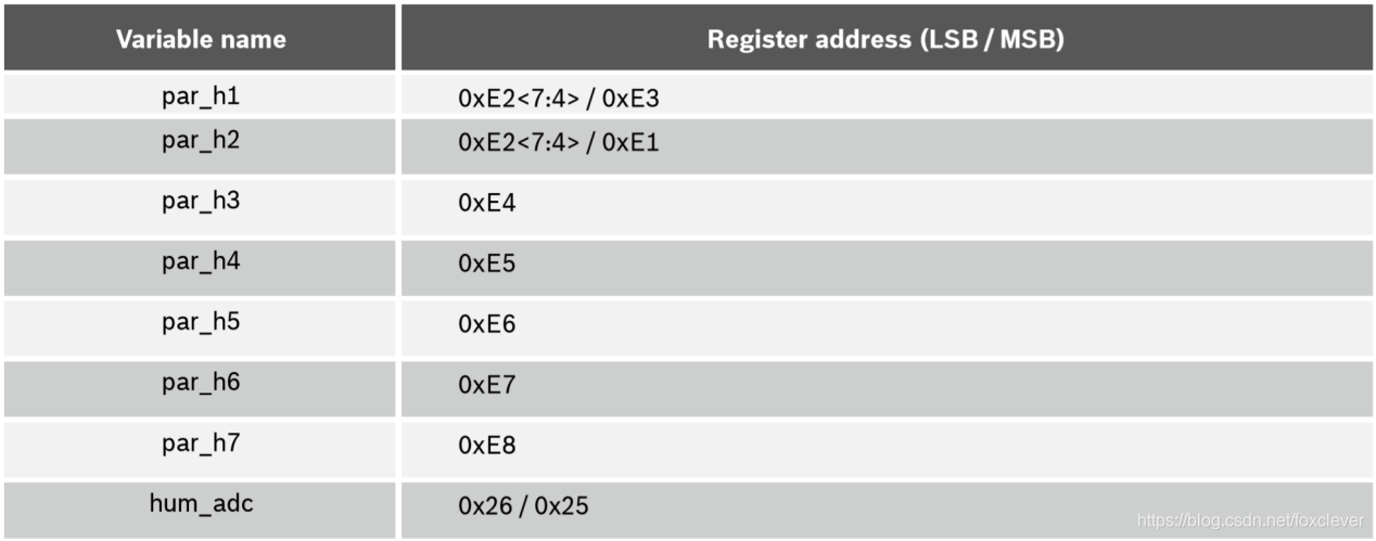对于湿度传感器,包括7个计算校准数据和一个ADC转换数据,其测量数据的校准数据存储结构及地址如下: