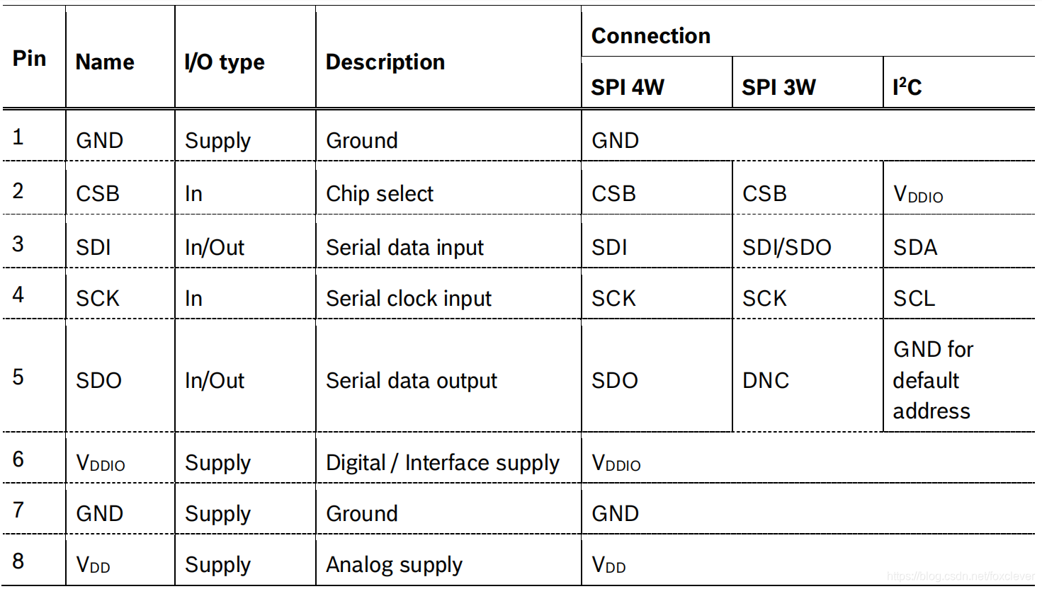 BME680环境传感器可以选择使用I2C接口或者SPI接口,在不同的接口模式及下各个引脚的定义及功能有一些差别。其具体分配及定义如下所示: