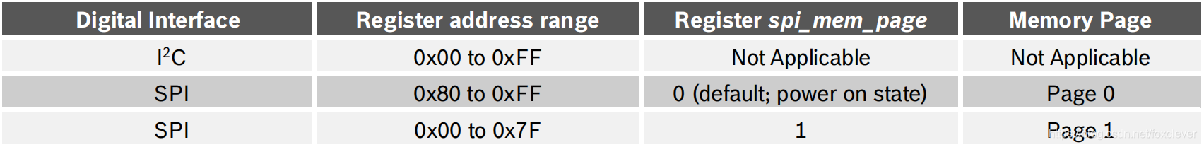 这里我们需要说明一下,BME680的存储器地址范围是0x00~0xFF,在I2C接口通讯时,通讯采用的是8位寄存器地址正好符合对应的寻址范围。但是采用SPI接口通讯时,寄存器地址的最高为被用于区分读写操作,所以地址只有7位,存储空间被分为2页。具体如下: