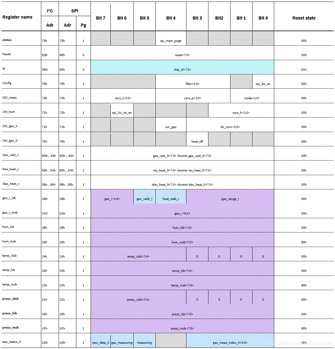 BME680环境传感器寄存器都是8位的,所有的操作均通过对寄存器的读写来实现。全部控制寄存器及数据寄存器的结构和地址如下: