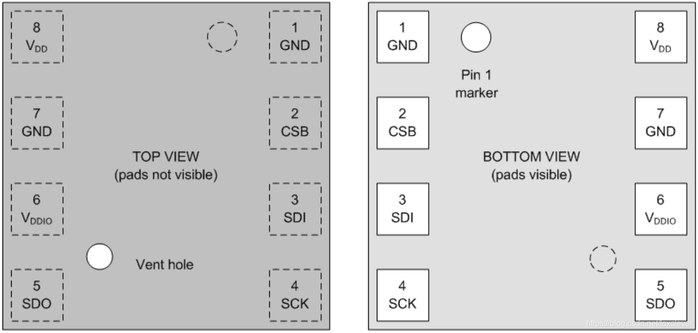 BME680由一个8针金属盖3.0 x 3.0 x0.93mm³LGA封装组成,旨在根据特定的工作模式,长期稳定性和高EMC稳健性进行优化消耗。可以选择采用I2C接口或者SPI接口。其管脚排布如下图: