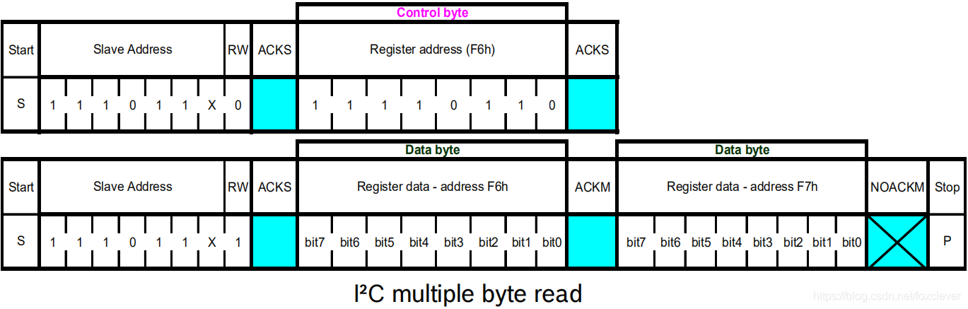 读寄存器的处理方式与写寄存器是类似。在I2C接口方式下,将从站地址的最低位置1来表示读。在I2C接口方式下,读寄存器的时序图如下所示: