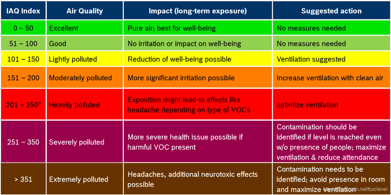 BME680采用了博世软件环境群组解决方案。该解决方案使用智能算术方法将空气质量索引(IAQ)作为输出。该指标将IAQ划分为0到500的索引数值用以指示IAQ,具体划分如下所示: