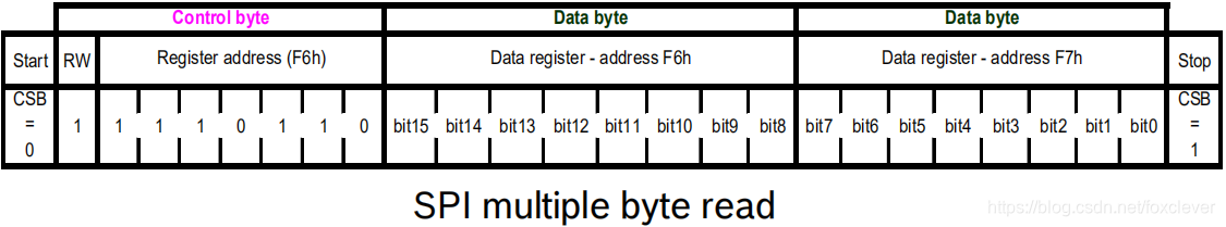 而在SPI接口方式下,通过将寄存器地址的最改为置1来标识为读操作。事实上,所有寄存器地址的最高为都是1,所以在读操作时实际不需要做处理。在SPI接口方式下,读寄存器的时序图如下所示: