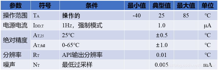 BME680也集成了温度传感器用以检测温度数据,温度数据除了指示环境温度外,同时用于压力和湿度的补偿计算。温度传感器的性能参数如下: