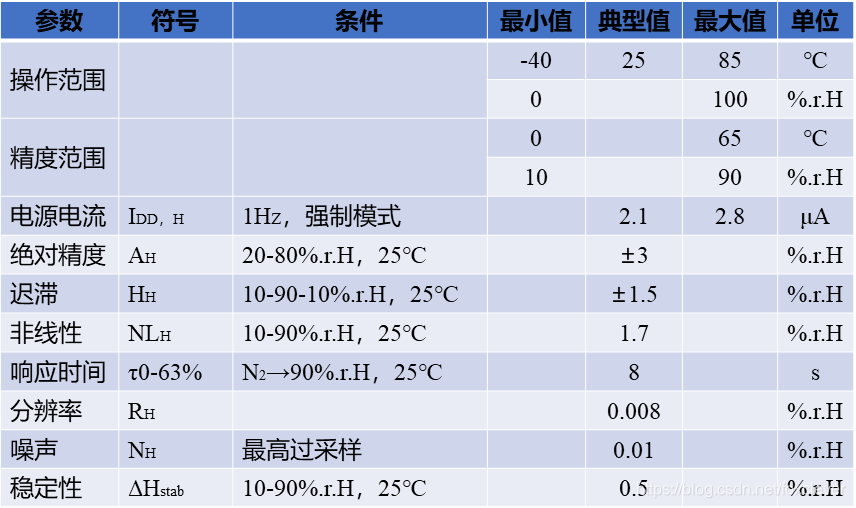 BME680集成了湿度传感器用于外部环境中湿度数据的采集。湿度传感器的性能参数如下: