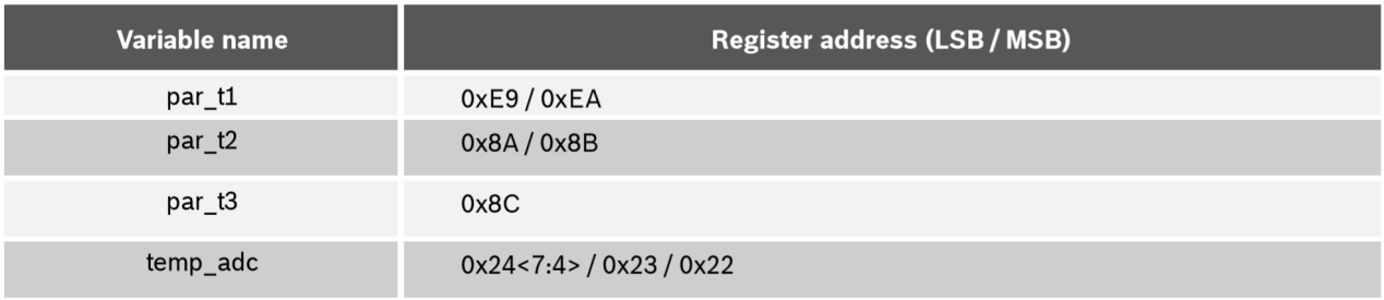 对于温度传感器,包括3个校准参数和一个ADC测量数据,其测量数据和校准数据的存储结构及地址如下: