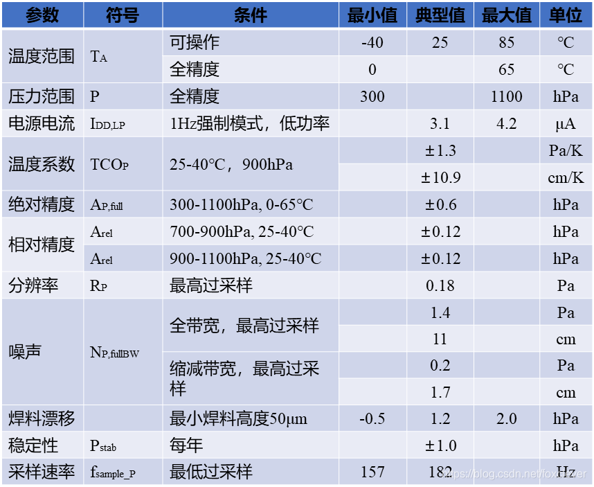 BME680集成有大气压力传感器用于检测外部环境的绝对压力。压力传感器的性能参数如下: