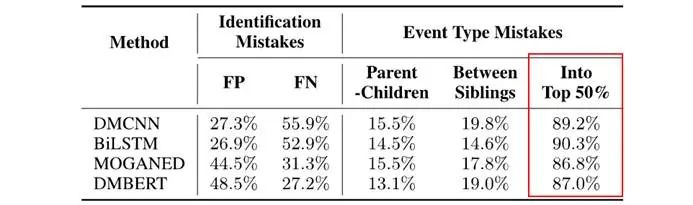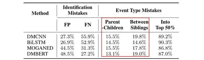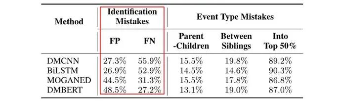 第一种类型的错误,即假阳性和假阴性,可以看到这个类型的错误占错误比例是最高的,表明真正从文本中检测事件语义这一步骤是非常困难的,这也是将来模型要首先攻克的方向。