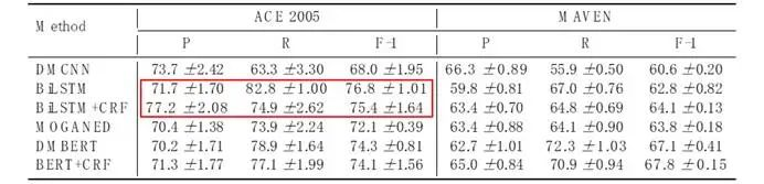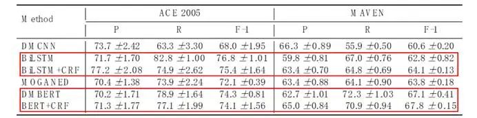 进一步来看,以BiLSTM和BiLSTM+CRF作为模型,DMBERT和BERT+CRF作为模型,两对模型对比可以看出,加入CRF的模型表现在MAVEN上是要比基础模型要好的,而在ACE 2005上,它的提升不会很明显。考虑到CRF的主要作用是考虑一句话中多个事件之间的联系,可以证明之前所说的观察,启发之后的模型设计更多的往这一点上考虑。