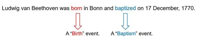 比如,在图1中,born是一个触发词,触发了birth这一事件,同时baptized也是一个触发词,触发了baptism这一事件。简单地说,事件检测任务的目的是从文本中检测出所关心的事件。