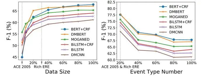 MAVEN数据集的一个显著优势是做了更多的数据和事件类型,为了观察数据量和事件类型是否足够,做了两个对比实验。
