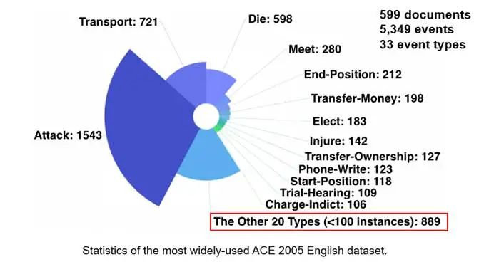 以目前最广泛使用的事件检测数据集ACE 2005为例,它只有不到600篇文档和5000多个标注出来的事件实例,仅仅覆盖了33个事件类型,这样的事件规模在现在看来是非常小而且难以充分训练模型的。同时由于难以避免的数据不平衡性,在这33个类别中,有20个事件类别只有不到100个标注实例。数据本身就非常小,再加上这么长尾的分布,很难去训练和稳定评测对数据量需求比较大的神经网络模型。