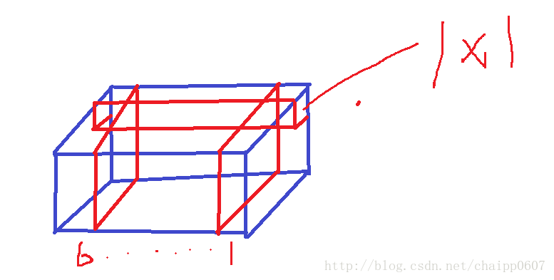 如下图就是一个W*H*6的特征,而1*1的卷积核在图上标出,卷积核自身的厚度也是6(图画的好难看!!)