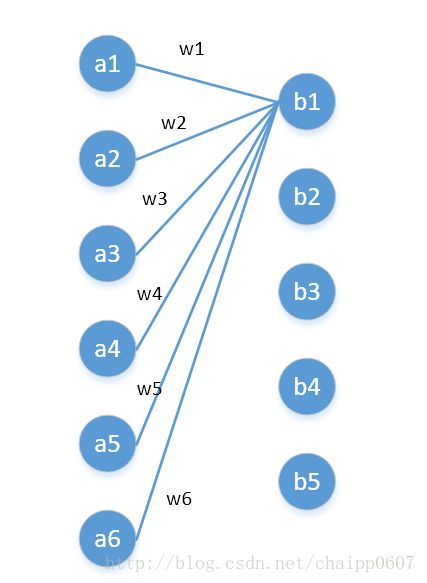 第一层有6个神经元,分别是a1—a6,通过全连接之后变成5个,分别是b1—b5,第一层的六个神经元要和后面五个实现全连接,本图中只画了a1—a6连接到b1的示意,可以看到,在全连接层b1其实是前面6个神经元的加权和,权对应的就是w1—w6,到这里就很清晰了: