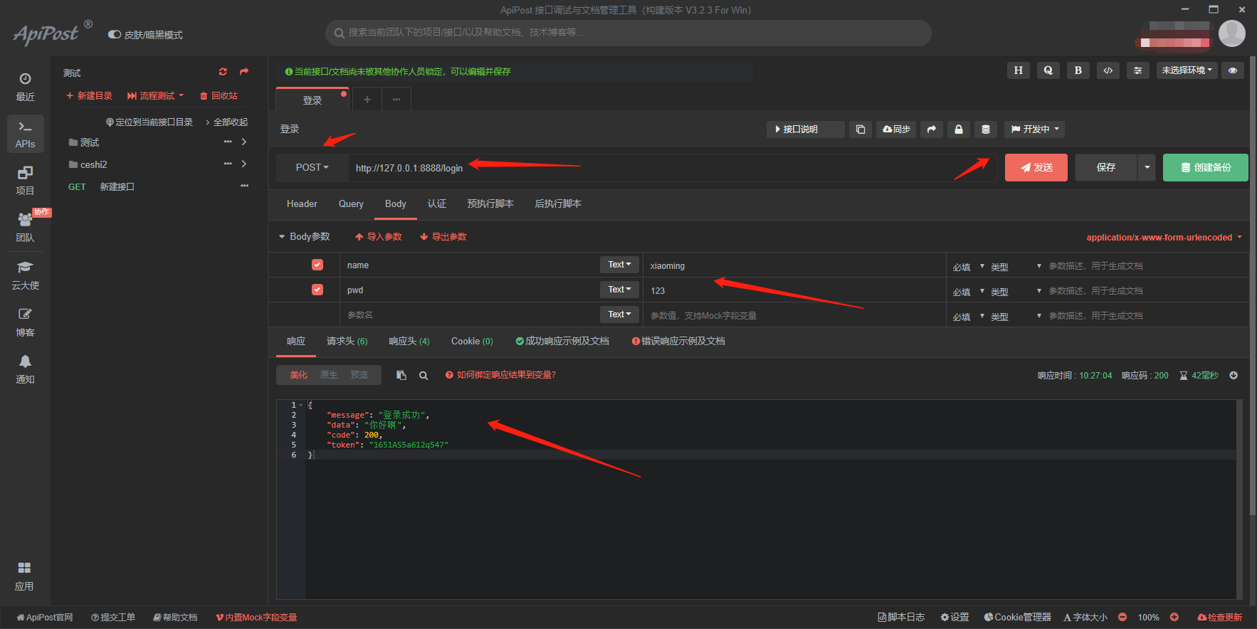 使用apipost进行接口测试,输入url地址,请求方法,参数点击发送查看接口是否正确。
