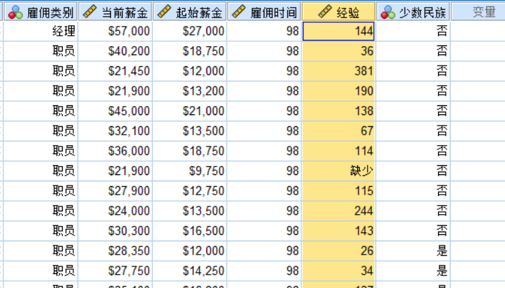 雇员数据原本是SPSS格式,其中以往经验这个变量有一小部分取值为0的,即无经验,假设我们现在要将其认定为缺失值,需要重新将数字0认定为缺失值。