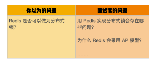 就算你是面试初级研发岗位,很多面试官也会站在你的能力上一层,继续问一些架构设计问题。比如 :“Redis 是否可以做为分布式锁?” 面试官更深层次的问题就是用 Redis 实现分布式锁会存在哪些问题,以及为什么 Redis 会采用 AP 模型等。