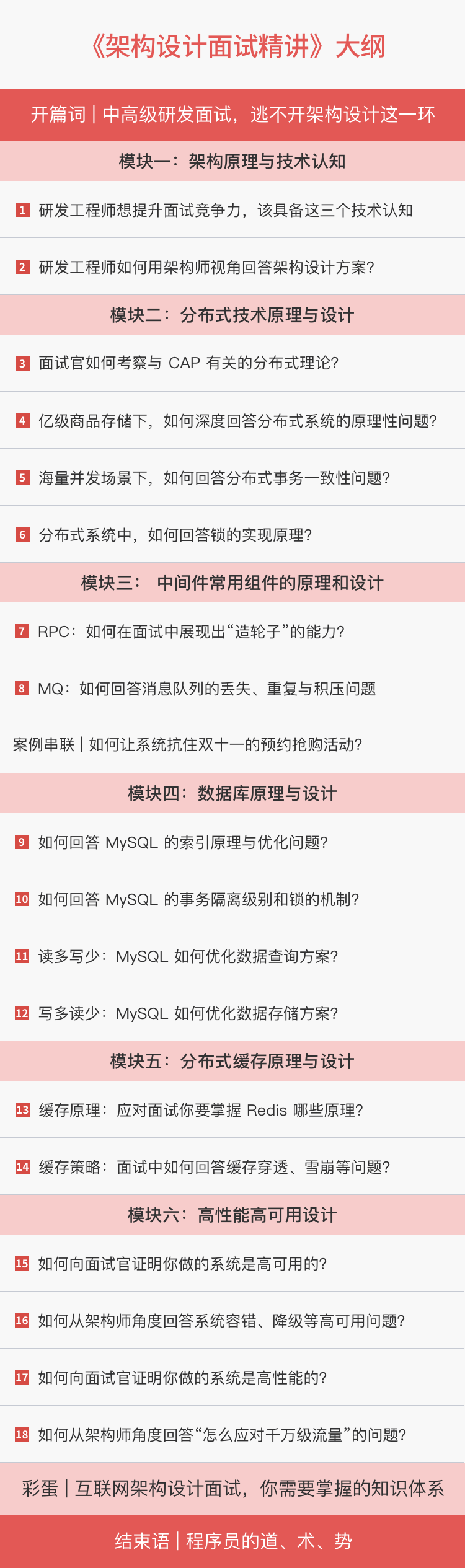 如果你想早一点了解架构设计知识,掌握面试的架构设计知识,那这个专栏可以帮你摆脱面试中的架构设计误区,识别技术陷阱,掌握面试中关于架构设计问题的知识体系。