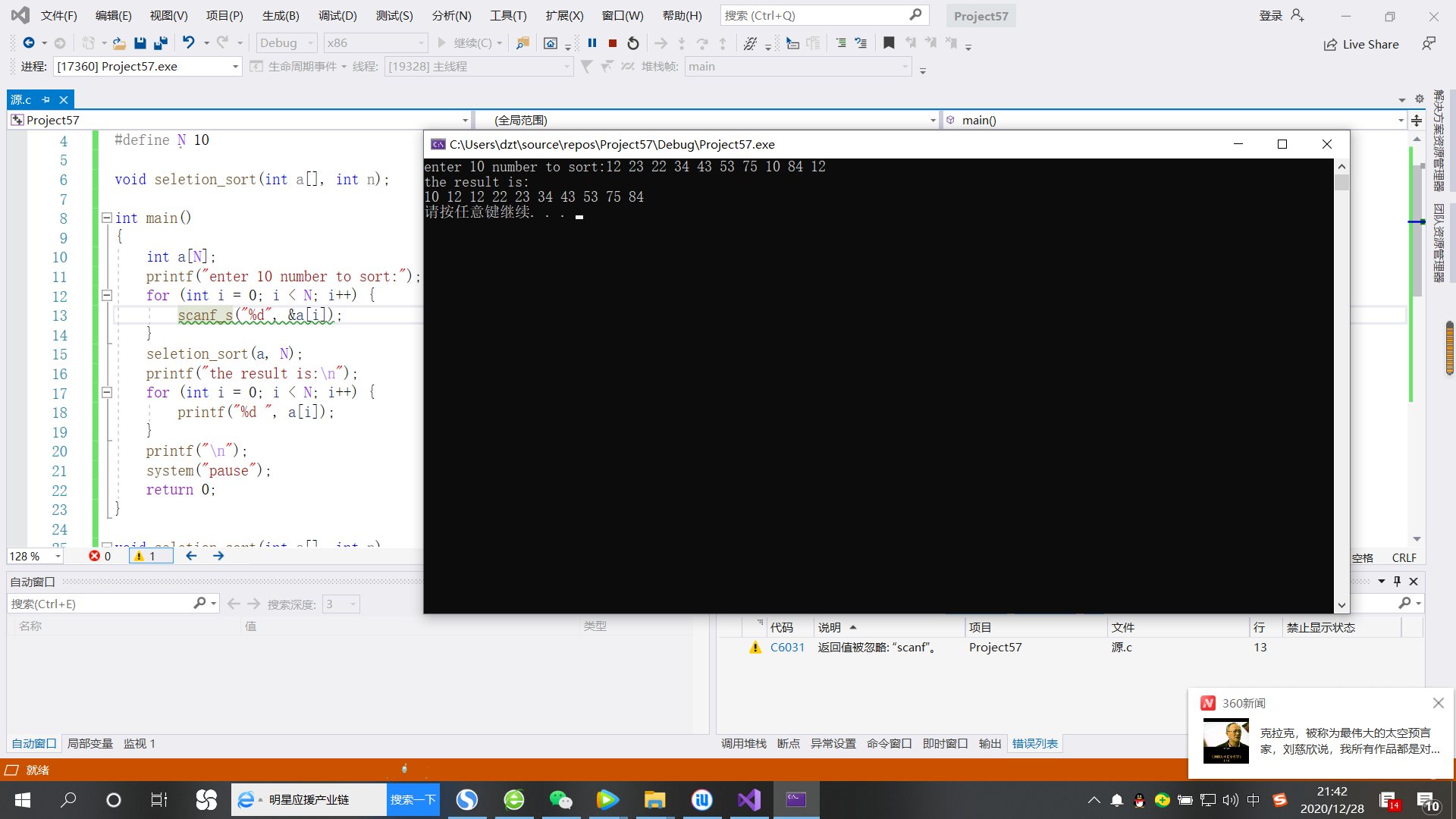 3.编写程序,要求用户录入一串整数(把这串整数存储在数组中),然后通过调用selection_sort 函数来排序这些整数。在给定 n 个元素的数组后,selection-sort 函数必须做下列工作: