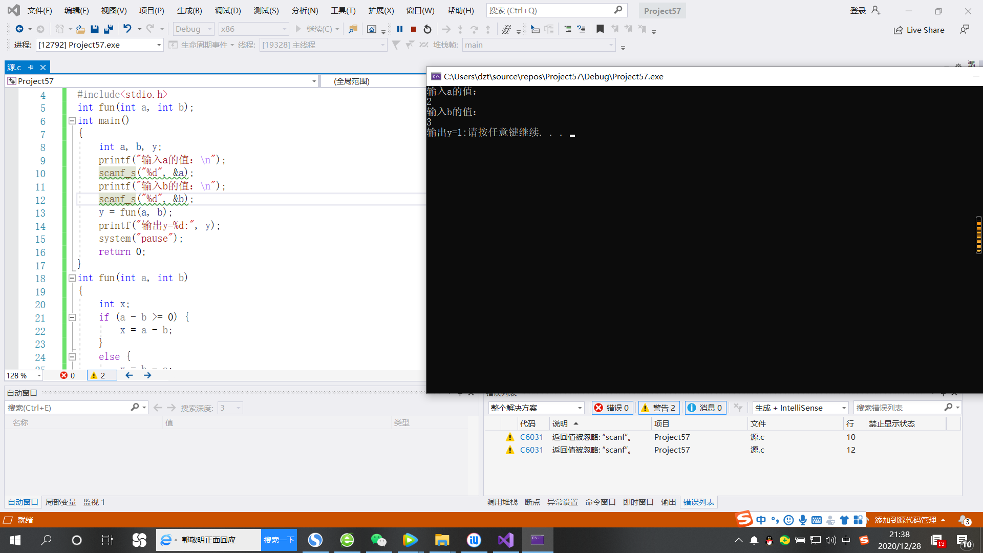 2.编写 fun 函数求两个数之差的绝对值,将差值返回主调函数,编写完整程序实现函