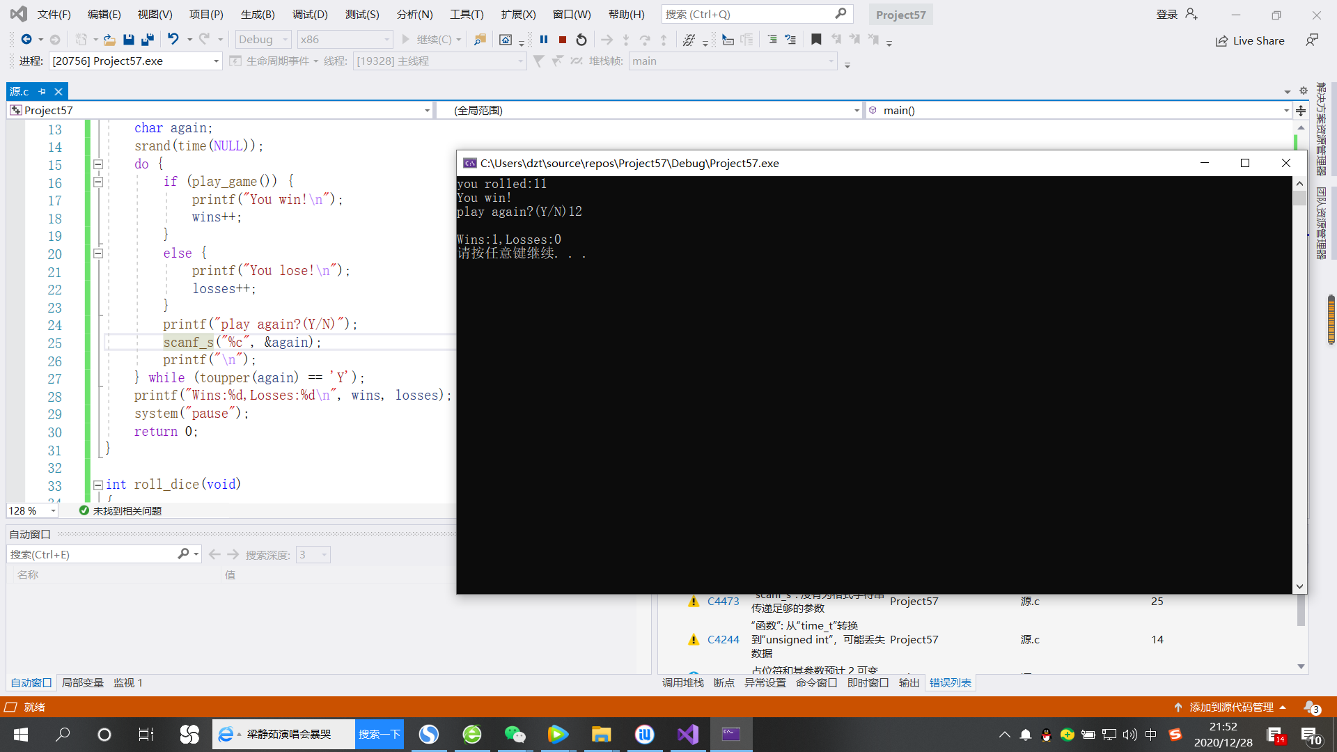 一次掷骰子游戏(调用 roll_dice 确定每次掷的点数),如果玩家获胜则返回 true,如果玩家落败则返回 false。play_game 函数还要显示玩家每次掷骰子的结果。main 函数反复调用 play_game 函数,记录获胜和落败的次数,并显示“you win”和”you lose” 消息。提示:使用 rand 函数生成随机数,