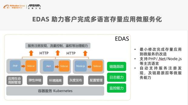 企业级分布式应用服务 EDAS 是一个应用托管和微服务管理的 PaaS 平台,基于容器服务K8s提供应用生命周期管理、弹性伸缩、环境隔离、灰度发布、配置管理等功能,同时配置了链路跟踪、监控、日志管理等能力,同时支持 Spring Cloud、Dubbo 等微服务运行环境。可帮助用户以最少的修改成本完成对存量应用的微服务改造。