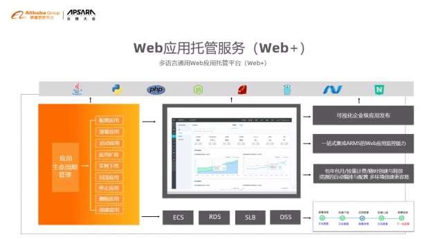 阿里云Web应用托管服务(Web+)是一款用来运行并管理 Web 类、移动类和 API 类应用程序的 PaaS 产品。支持 Java、Python、Node.js、PHP、Ruby 和 Go 等多种语言编写并构建应用程序。客户在无需管理底层基础设施的情况下,便可简单、高效、安全而又灵活的对应用进行部署、伸缩、调整和监控。例如,深圳奥哲网络科技有限公司基于 Web 应用托管服务的自动生成环境,无须每次都要手动部署并交付系统给客户。