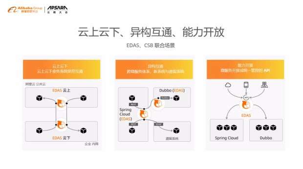 此外, EDAS 联合云服务总线 CSB ,将云上和云下,异构系统之间打通,客户可在 EDAS 对各类不同的系统进行统一管理,同时,将微服务开放成统一管控的 API ,对各类业务端进行能力开发,供消费方订阅调用,并提供审批授权、服务管控和计量监控等能力。