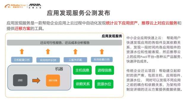 面对中小企业应用快速上云的场景, APDS 可以快速发现应用的各组件及其依赖关系,分析识别各应用组件的资源水位和性能表现,并推荐相应的云服务。面对传统企业迁云的场景, APDS 可以快速建立起即时的资产库,包括主机和进程信息、资源使用水位以及各应用和组件之间的依赖关系,为架构师制定详细的迁云方案提供数据依据。