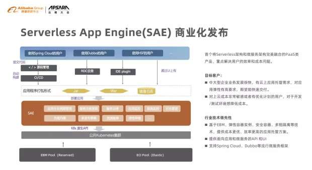 Serverless 应用引擎(简称 SAE )是阿里云首个基于将 Serverless 架构和微服务架构完美融合的 PaaS 类产品,解决了用户的效率和成本问题。相比于普通应用部署方式, SAE 无须购买和运维底层 IaaS 资源,创建 VPC 和创建应用两步到位,提高 2 倍效率,同时基于K8s,原生支持 dubbo 和 Spring Cloud 。在成本方面,无论是在非 724 小时长期使用的开发测试环境下,还是在 724 小时长期使用且存在业务流量高低峰的生产环境下, SAE 按量付费的费用,相比 ECS 按量付费,下降超 10% 。