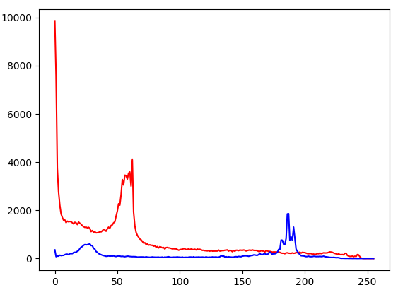 在Python中利用opencv中的calcHist()方法获取其直方图数据,返回的结果是一个列表,使用matplotlib,画出了这两张图的直方图数据图