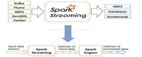 Spark Streaming的基本原理是将输入数据流以时间片(秒级)为单位进行拆分,然后以类似批处理的方式处理每个时间片数据,基本原理图如下: