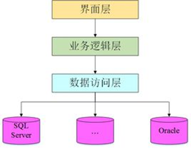 再后来的项目开始有了一点点改变,这个时候的架构,被成为“三层架构“。在.NET开发史上,三层架构成为一种历史悠久的框架,从十年前开始,一直到今天,依然是.NET开发者最为熟练的技术框架。如图所示,三层架构在客户端和数据库之间增加了一个中间层,将有效的业务规则、数据访问等放在业务层中进行处理。界面层主要使用对数据的绑定渲染,再通过数据层实现数据的提交处理。有的开发者说,三层架构通吃一切项目,似乎所有的项目都可以用三层架构来套用。然而在实际工作中,往往会忽略了业务逻辑层,业务逻辑往往会放在界面层或数据层中,最终导致界面层和数据层充斥着臃肿的代码,令人难以维护。
