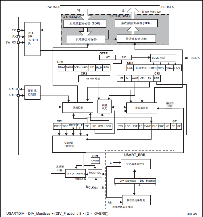 - 波特率寄存器 (USART_BRR) - 12 位尾数和 4 位小数。
