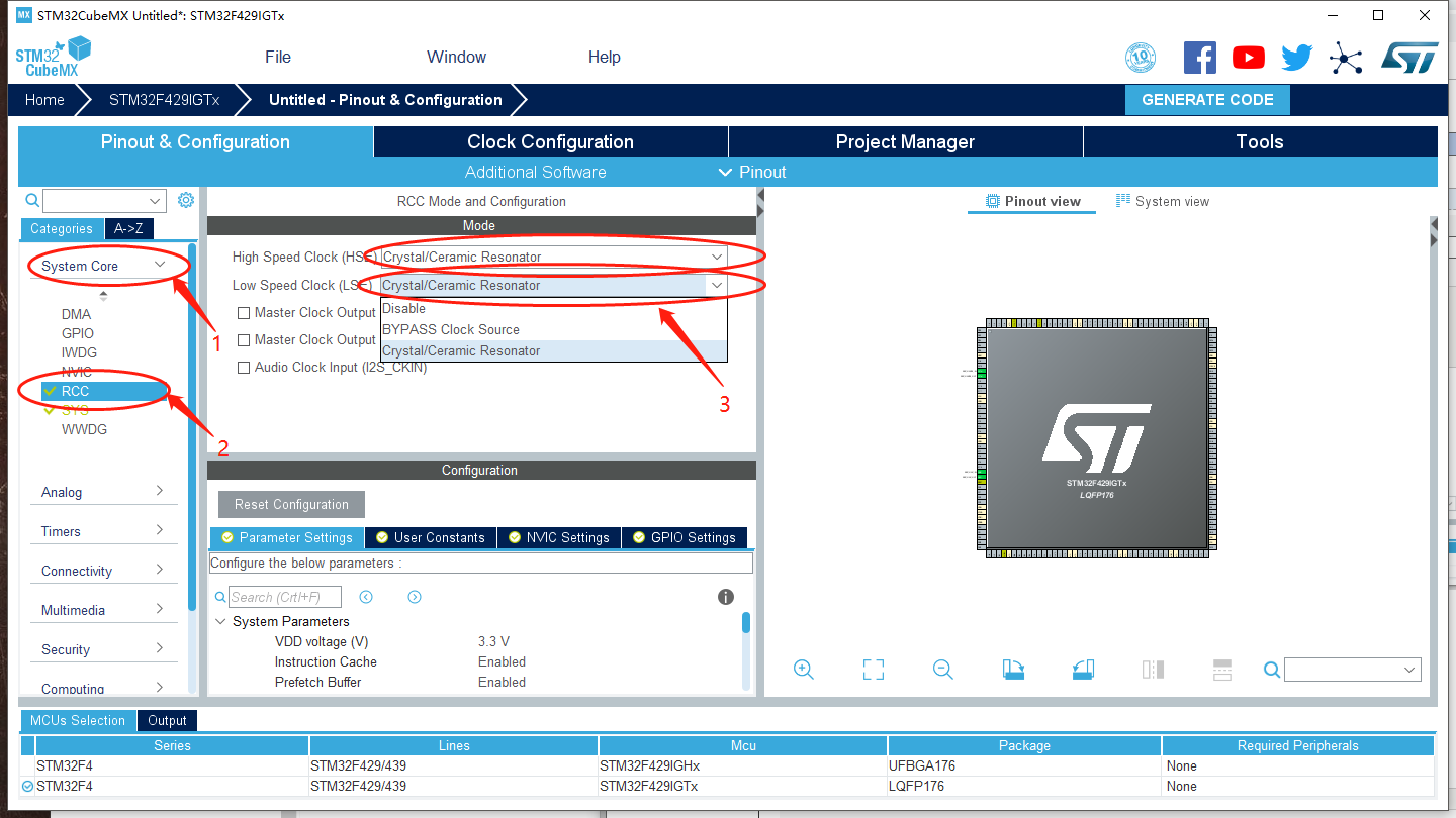 在使用STM32CubeMx配置的时候,首先要选择正在使用的芯片的型号,再配置芯片的时钟,然后才去配置所需要用到的功能。