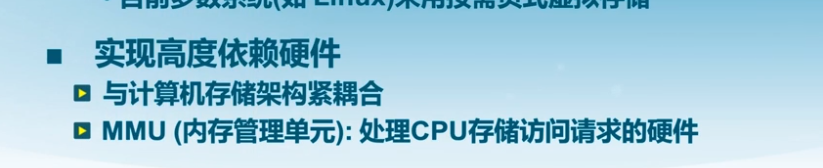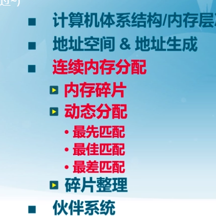 内存管理机制: + 重定位:(relocation) + 分段 : (segmentation) + 分页 : (paging) + 虚拟储存(virtual memory) 多数系统 按 需页式虚拟储存