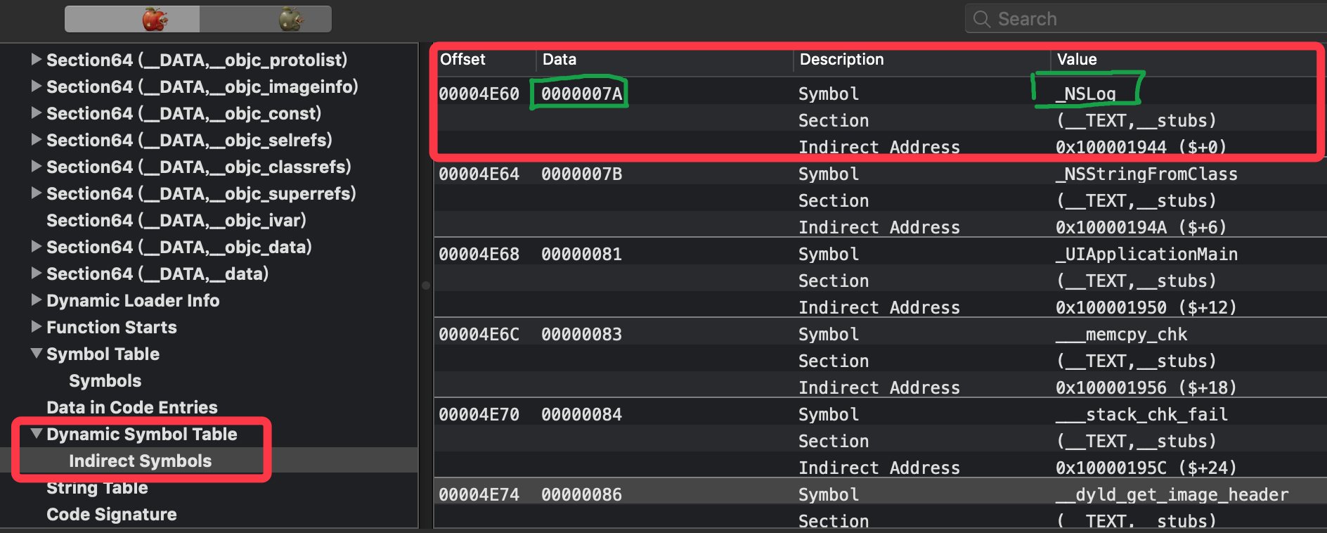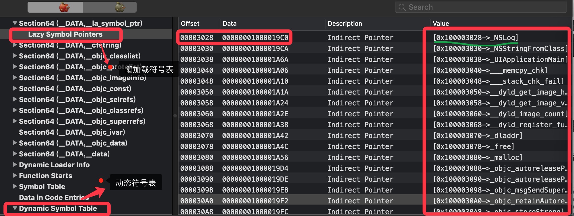 懒加载表是和动态符号表是一一对应关系,通过上面发现NSLog函数时第一个,而对应的Dynamic Symbol table也是第一个,打开Dynamic Symbol table
