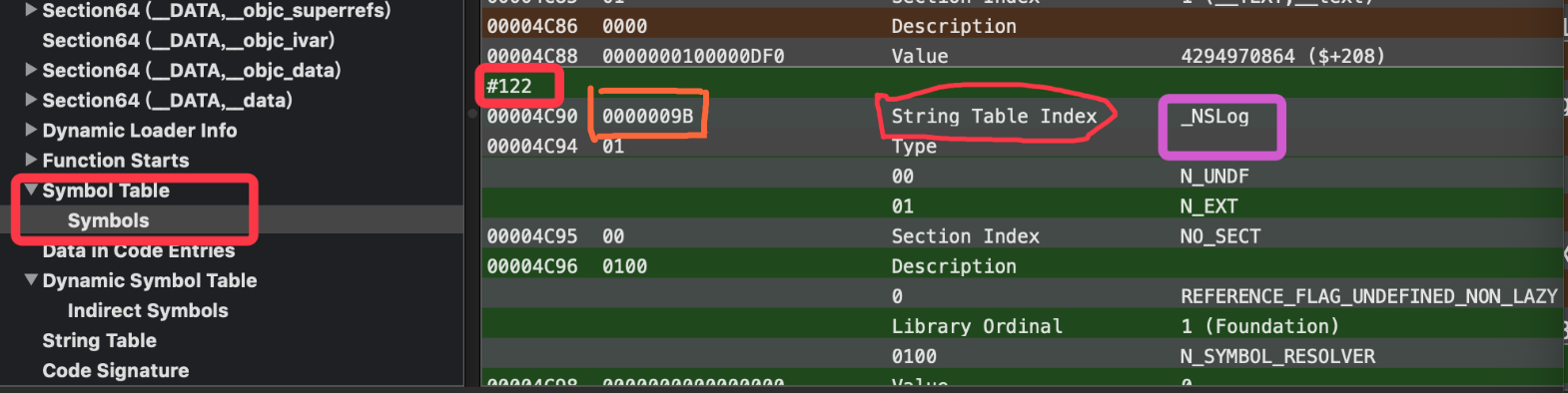 查看Dynamic Symbol Table 第一个也是NSLog,查看Data值为7A,对应的十进制为122,然后到Symbols Table里面查看122,如下: