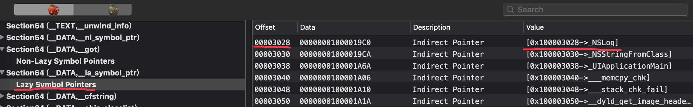 从图2看出offset偏移地址为3028,也就是NSLog函数文件的偏移地址,懒加载此表时在Mach-O文件偏移地址+函数偏移的地址。
