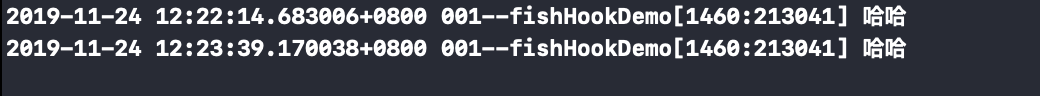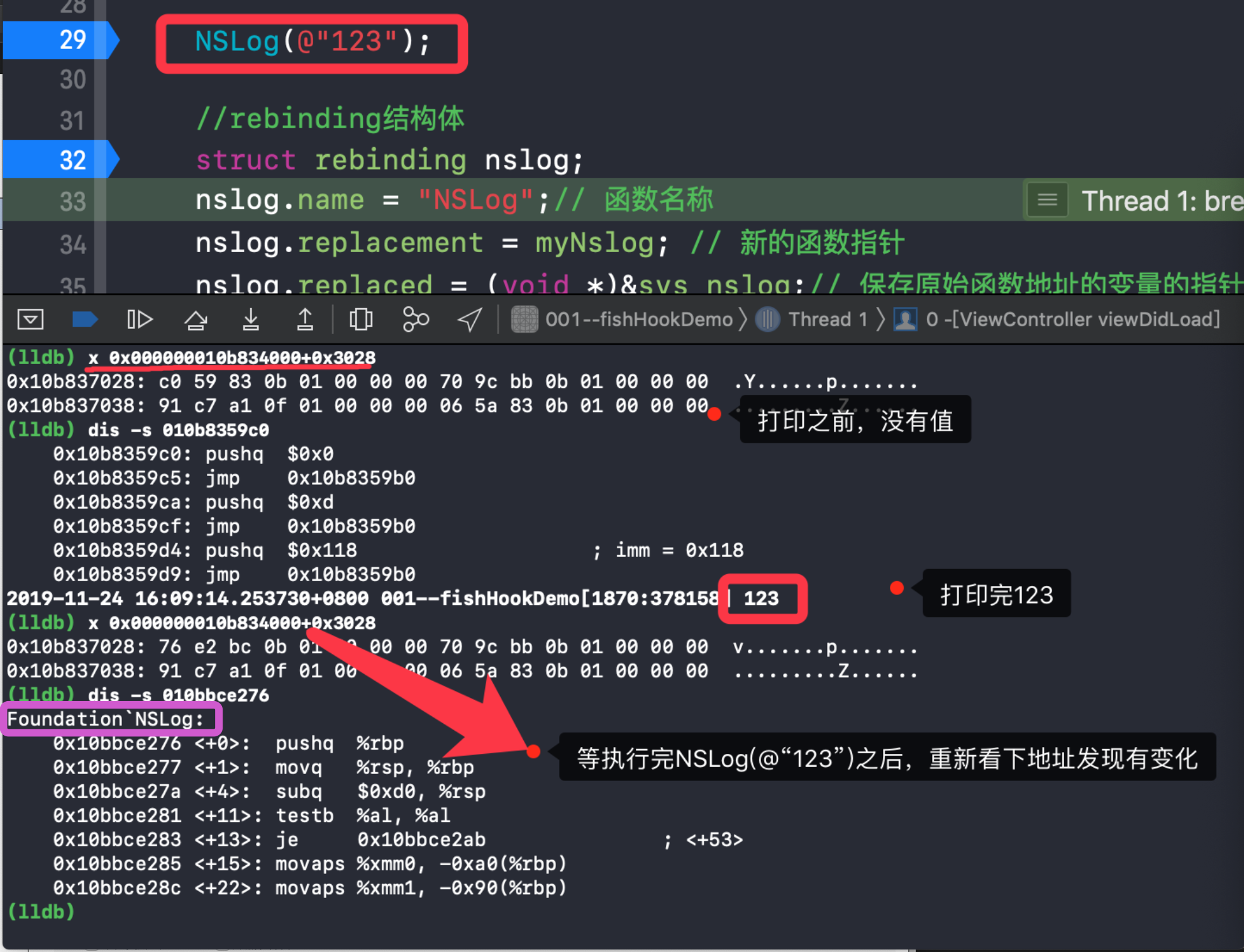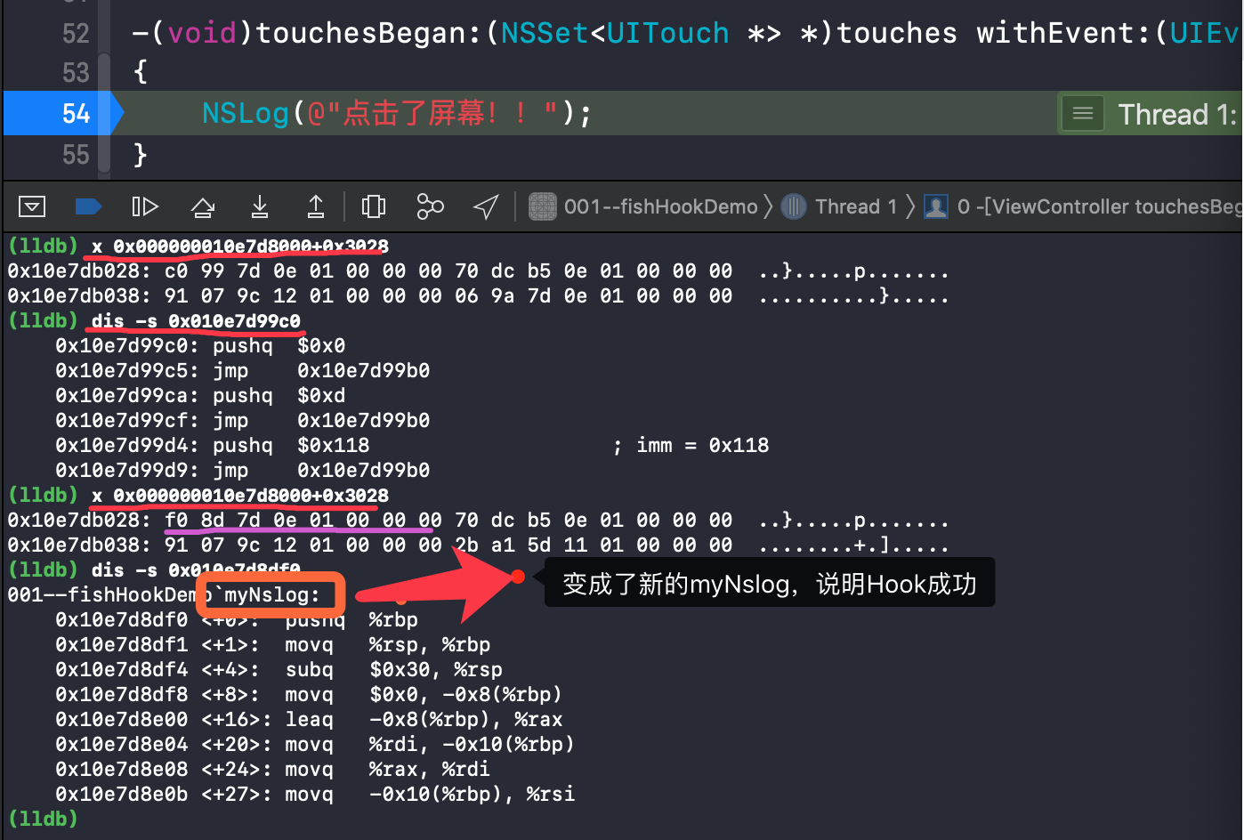 截图的前两次打印是程序运行时,但是未曾点击touchesBegan,后两次是点击屏幕时断点进入到了里面,再看内容,打印的对象是NSLog还是myNslog,通过上面发现是myNslog,说明Hook成功。