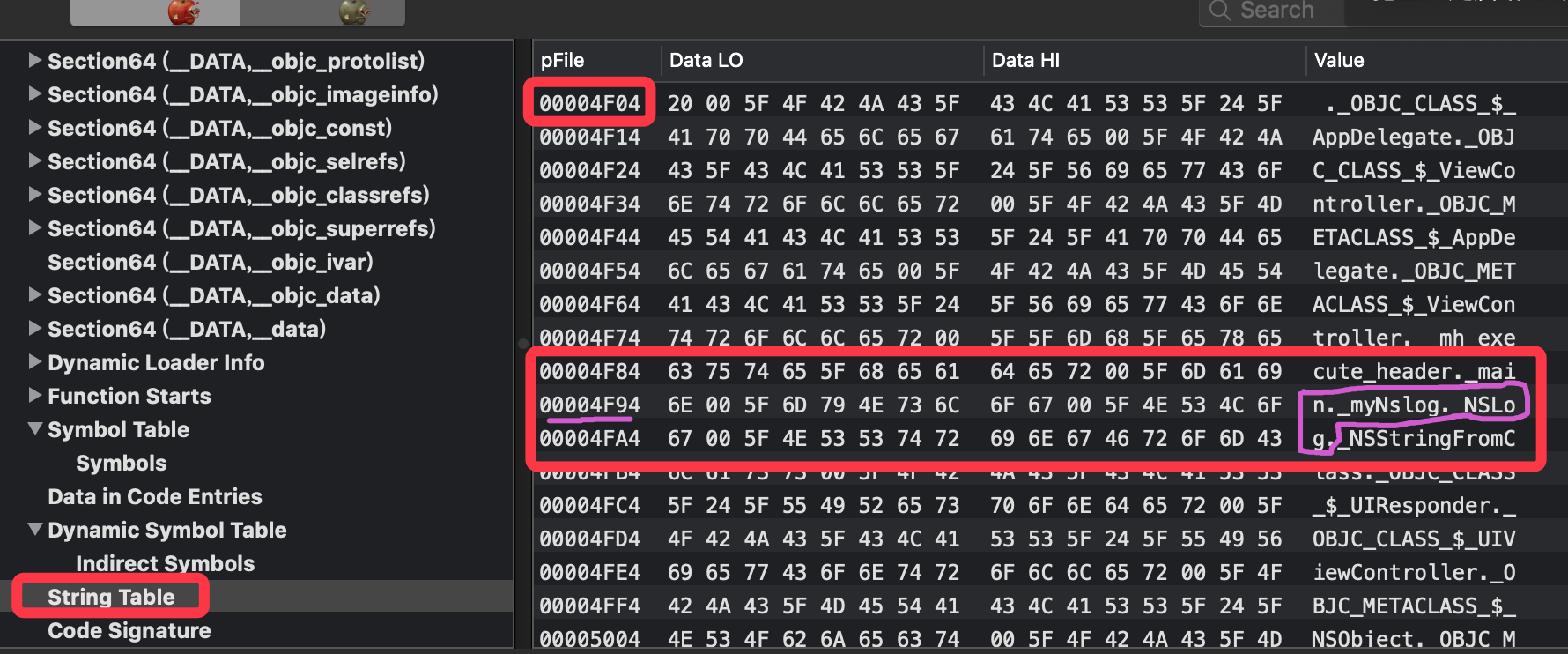 fishhook是根据方法字符串的名字“NSLog”,它是怎么找到的呢?下面将讲解利用符号表查看函数名称字符串。