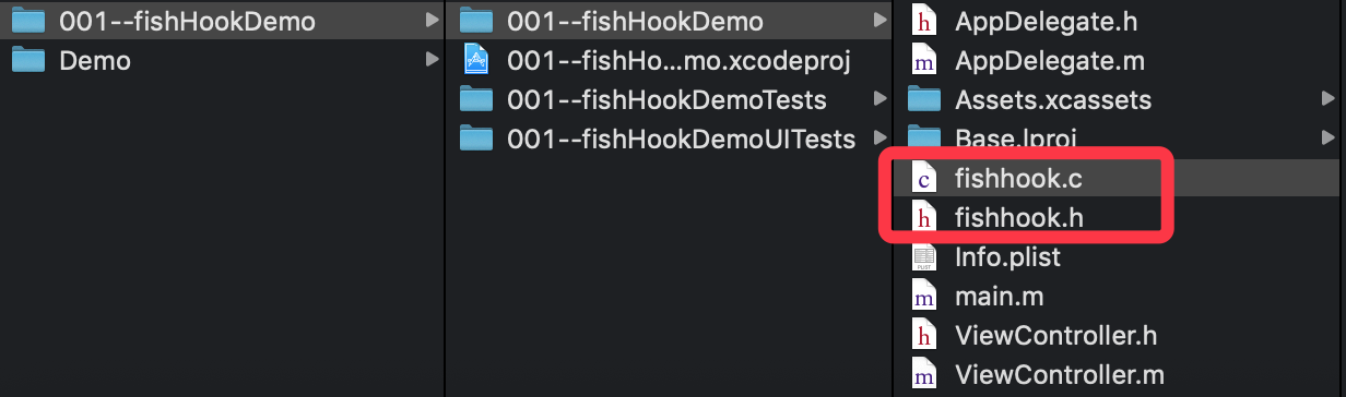 查看代码结构为,将红色圈起来部分移入到代码中,即可使用fishhook来hook代码。