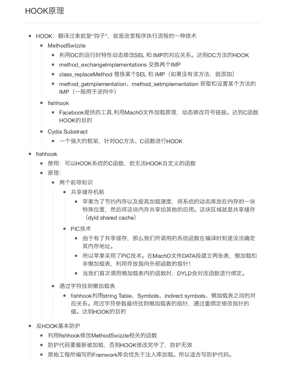 上面讲述了Hook的几种技术方式以及fishhook的原理探究,以及如何让别人的app实现自己的代码。下面我们对此总结一下,写了一个本篇博客的整个过程便于大家整理,希望对大家有所帮助加深理解。