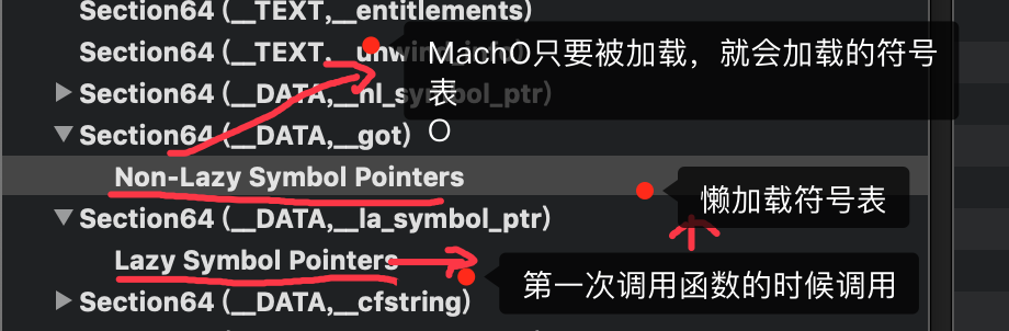 - Mach-O _data段建立了一个指针(也就是符号,实现指向内部的函数调用,指向了外部的函数地址),指向了外部函数(dyld),可读可写,当Mach-O被加载进去,就会指向所指的函数。