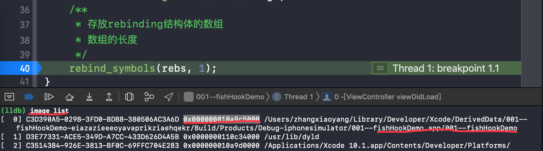 下面以Demo1查看,在Demo1打断点,查看Mach-O函数偏移地址,通过指令image list 第一个就是Mach-O内容和地址(本人上篇博客地址即可)