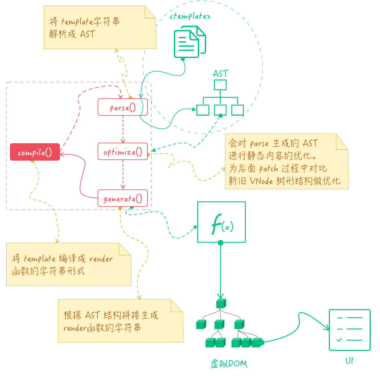 parse()函数:用来解析<template>,即解析器。主要功能是将template字符串解析成 AST。前面定义了ASTElement的数据结构,parse函数就是将template里的结构(指令,属性,标签等)转换为AST形式存进ASTElement中,最后解析生成AST。optimize()函数:用来优化静态内容,即优化器。主要功能就是标记静态节点,为后面patch过程中对比新旧 VNode 树形结构做优化。被标记为static的节点在后面的diff算法中会被直接忽略,不做详细的比较。这里的静态内容指的是 和数据没有关系,不需要每次都刷新的内容。generate()函数:用来创建render()字符串,即代码生成器。主要功能就是根据 AST 结构拼接生成render函数的字符串。