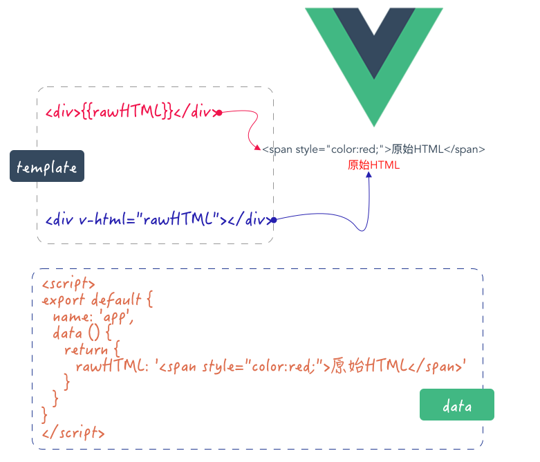 插值语法中(也就是{{}})会将数据解释为普通文本,而非HTML代码,为了输出真正的HTML,需要使用v-html指令,比如下面这个示例: